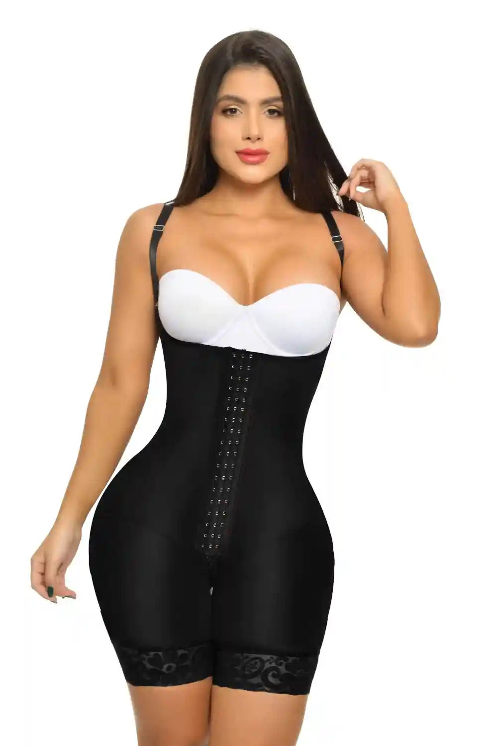 About the garment: The Gloria short braless body shaper is meant to help you get that hourglass figure by lifting, shaping, and slimming down your waist, abdomen, hips, back, thighs, and buttocks. This garment features thick straps, a high u-shaped back for back support, a zipper and eye closure, and a lace band to prevent it from rolling up.
