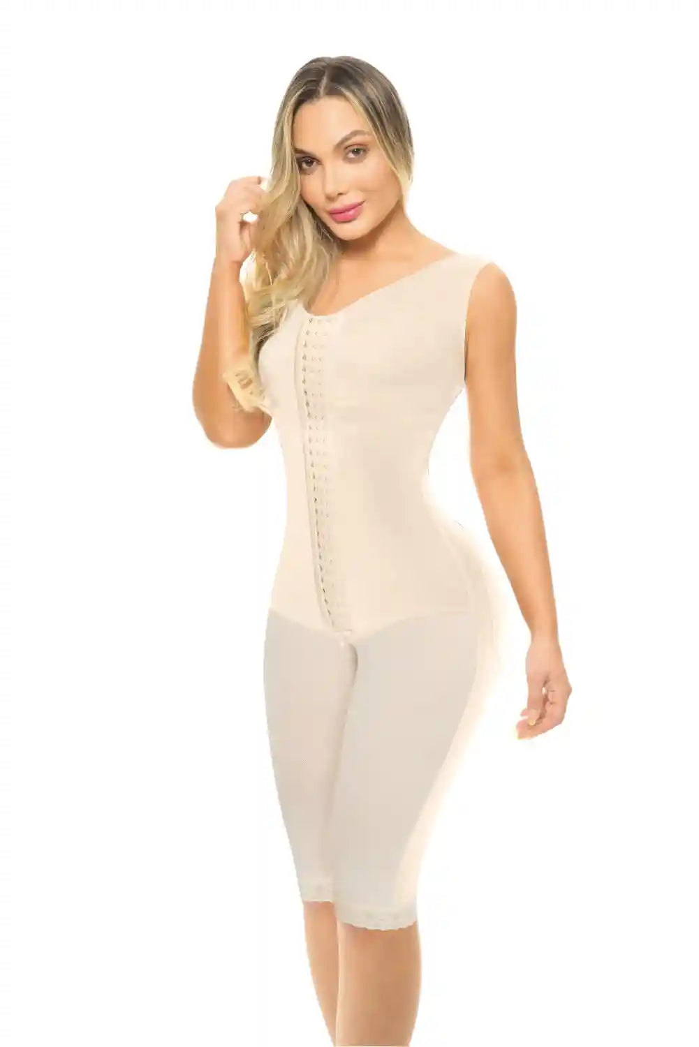 About the garment: The Gloria short braless body shaper is meant to help you get that hourglass figure by lifting, shaping, and slimming down your waist, abdomen, hips, back, thighs, and buttocks. This garment features thick straps, a high u-shaped back for back support, a zipper and eye closure, and a lace band to prevent it from rolling up.