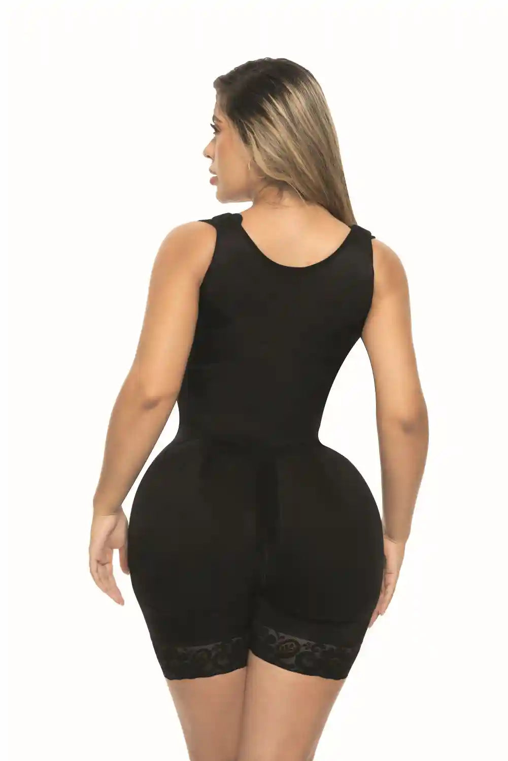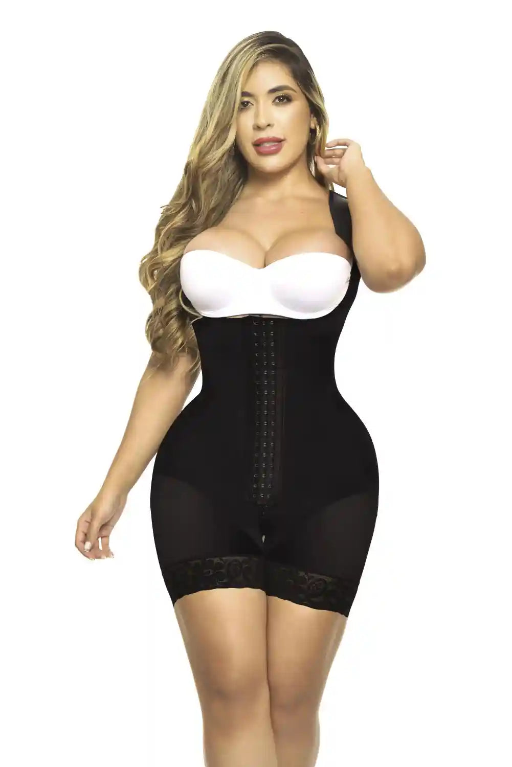 About the garment: The Gloria short braless body shaper is meant to help you get that hourglass figure by lifting, shaping, and slimming down your waist, abdomen, hips, back, thighs, and buttocks. This garment features thick straps, a high u-shaped back for back support, a zipper and eye closure, and a lace band to prevent it from rolling up.